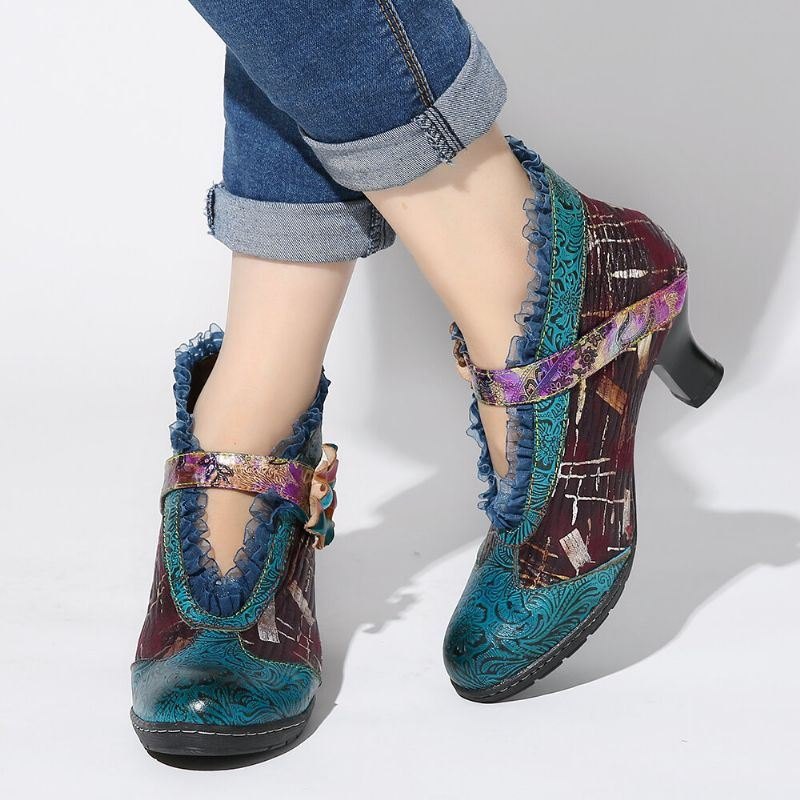 Blonder Ekte Skinn Spleising Blomster Lavhæl Elegante Pumper