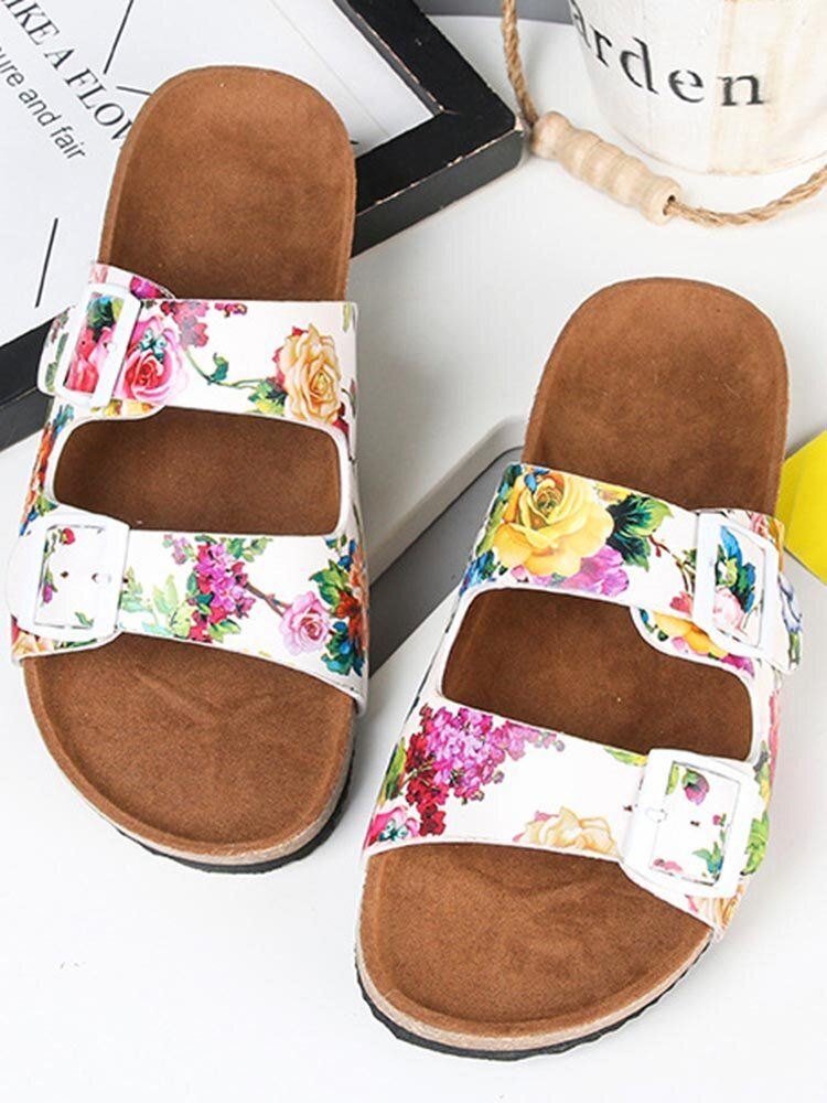 Dame Dobbel Spenne Blomstermønster Stropp Kork Fotseng Skyvesandaler