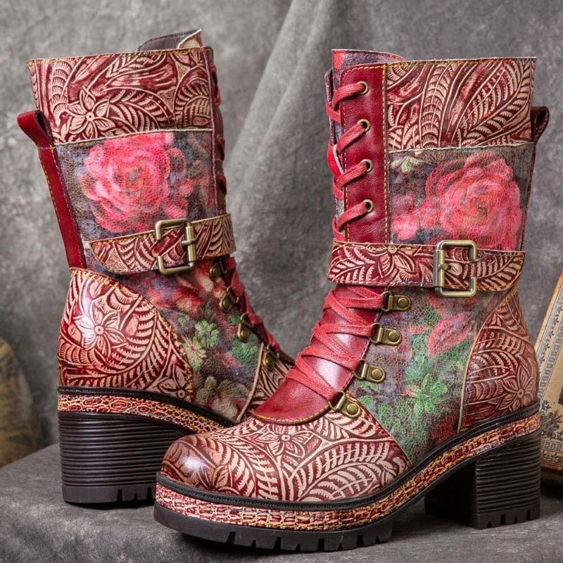Dame Ekte Skinn Blomstertrykk Varmt Fôr Korte Støvletter Med Kraftig Hæl