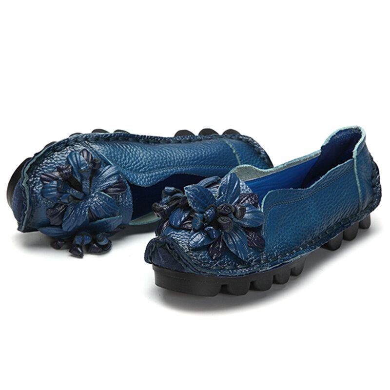 Dame Ekte Skinn Håndlaget Dekorasjonsblomster Vintage Slip On Flats Loafers