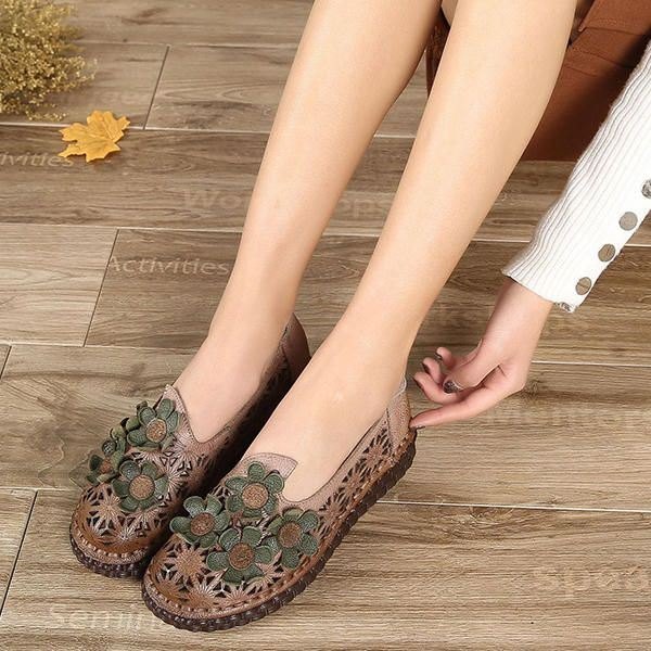 Dame Ekte Skinn Retro Håndlaget Sko Hollow Out Flower Flats