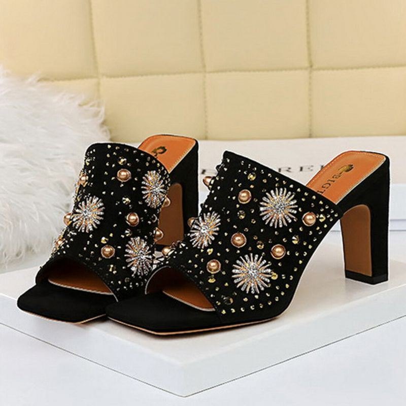 Dame Elegant Semsket Rhinestone Metal Revit Peep Toe Chunky Heel Stripe Tøfler