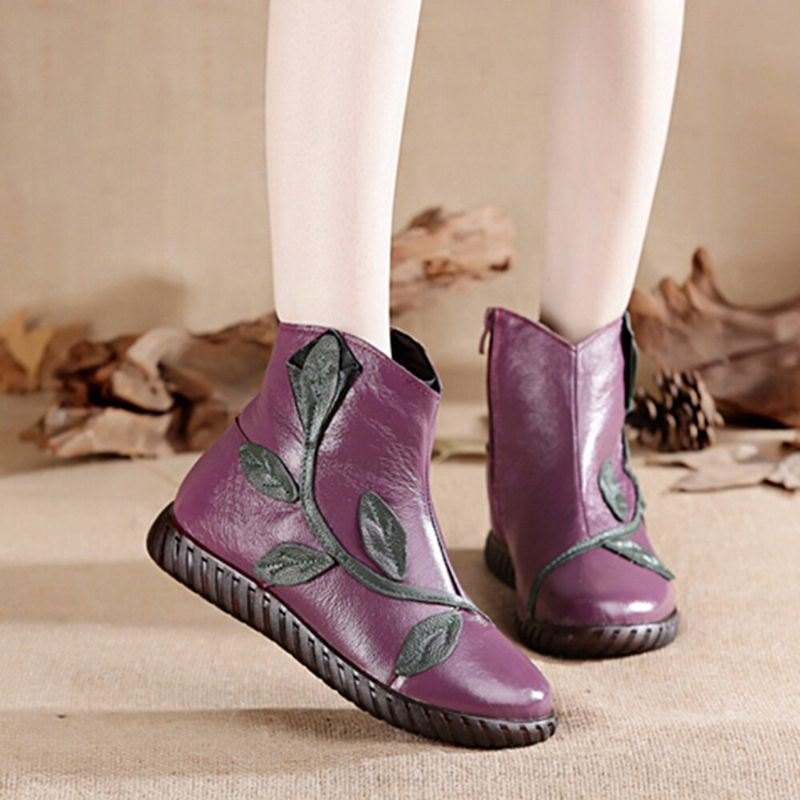 Dame Etniske Blader Skjøting Ekte Skinn Varm Side Glidelås Flate Ankelstøvletter