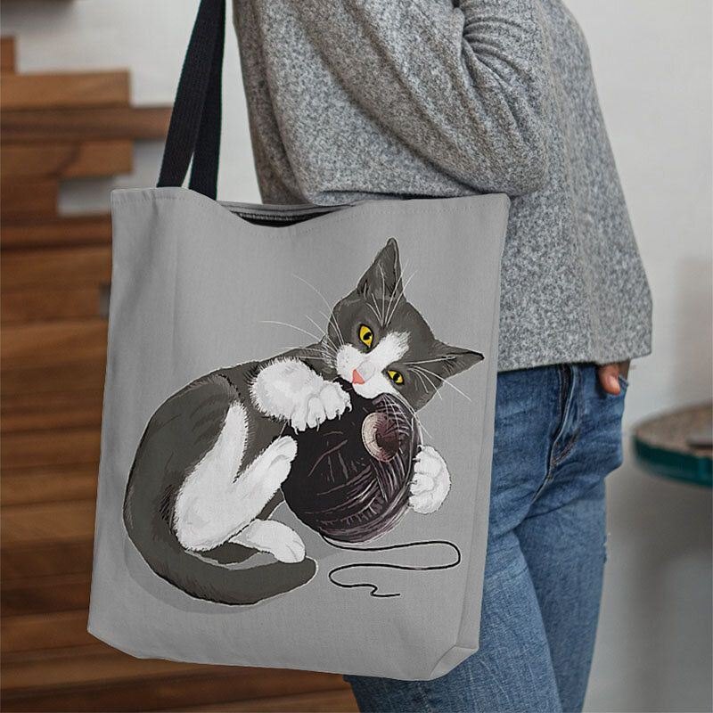Dame Følte Seg Søt Tegneseriekatt Leker Ullball Utskriftsmønster Uformell Skulderveske Håndveske Tote