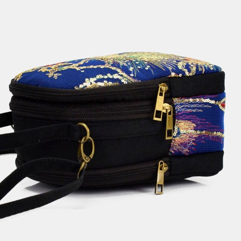 Dame Lerret Etnisk Stil Broderi Påfuglmønster Paljett Mini Multi-bære Veske Crossbody Bag