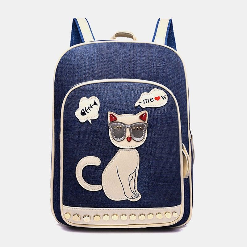 Dame Lerret Søt Kattetrykk Patchwork Uformell Ryggsekk Skoleveske