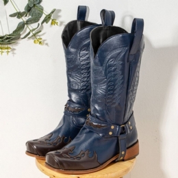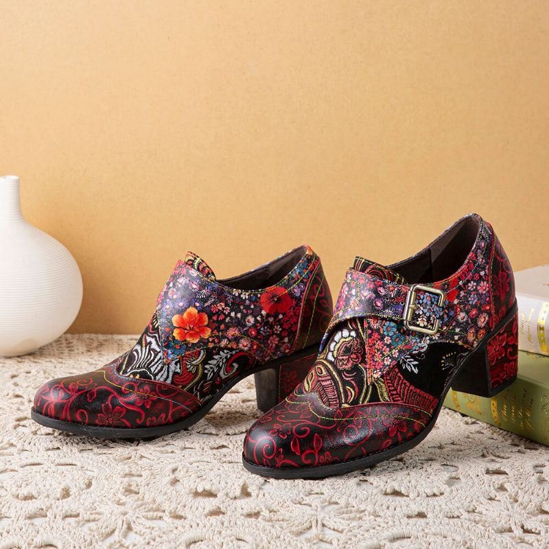 Dame Retro Blomstertrykk Skinn Myk Rund Tå Skulpterte Tykke Hæler