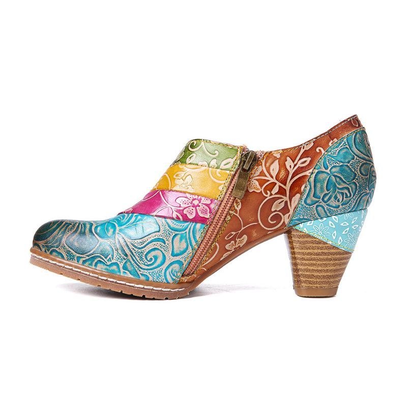 Dame Retro Floral Skinn Skjøte Glidelås Chunky Heel Pumps Dress Sko