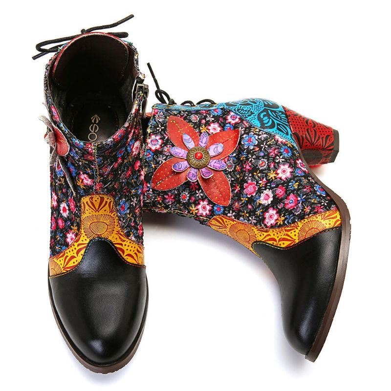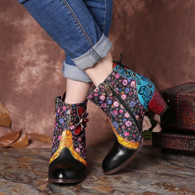Dame Retro Leaf Flower Leather Comfy Zipper Ankel Boots