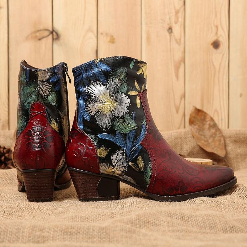 Dame Retro Pregede Blomster Stitching Lær Ankelstøvletter