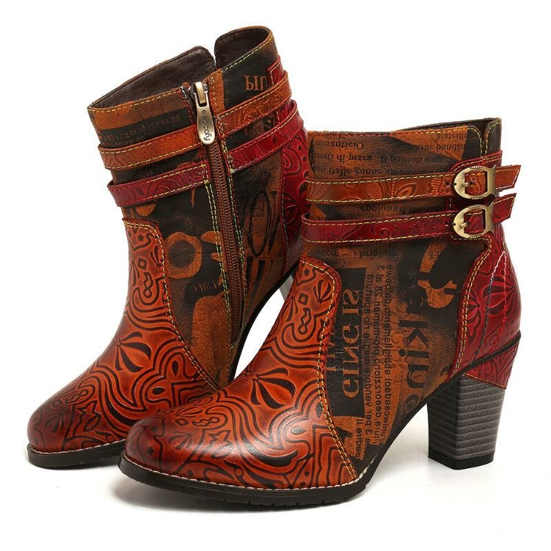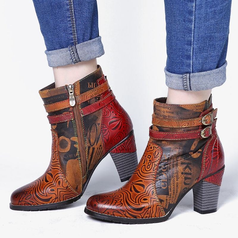 Damemønster Brun Spenne Deco Stablet Høyhælte Ankelstøvler Med Rund Tå Med Glidelås
