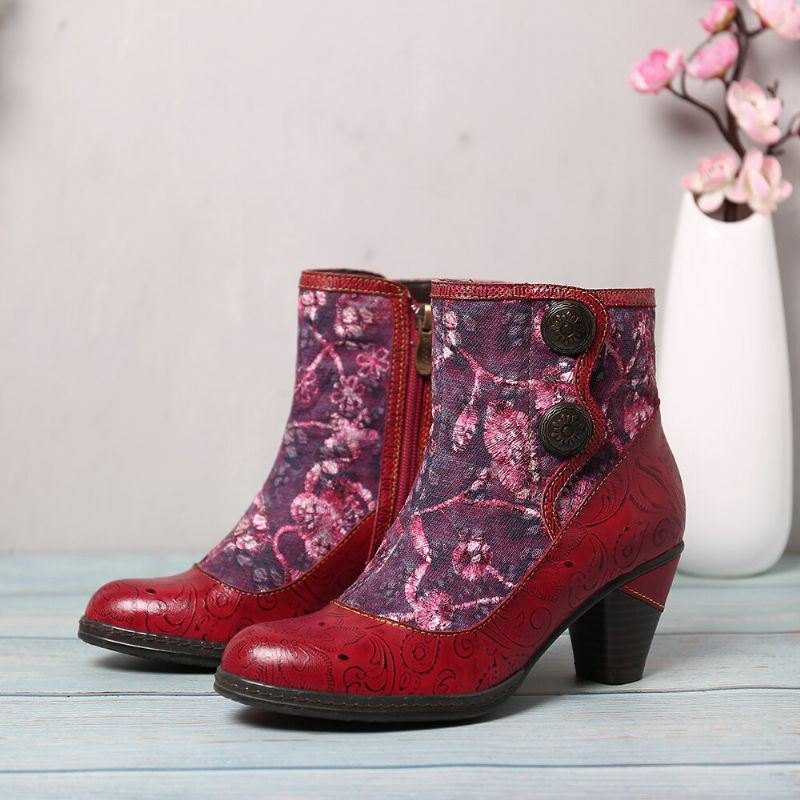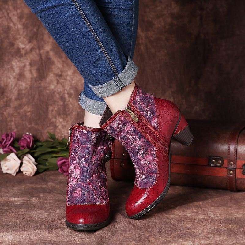 Damepreget Ekte Skinnskjøting Folkways Blomster Høyhælte Glidelåsstøvler