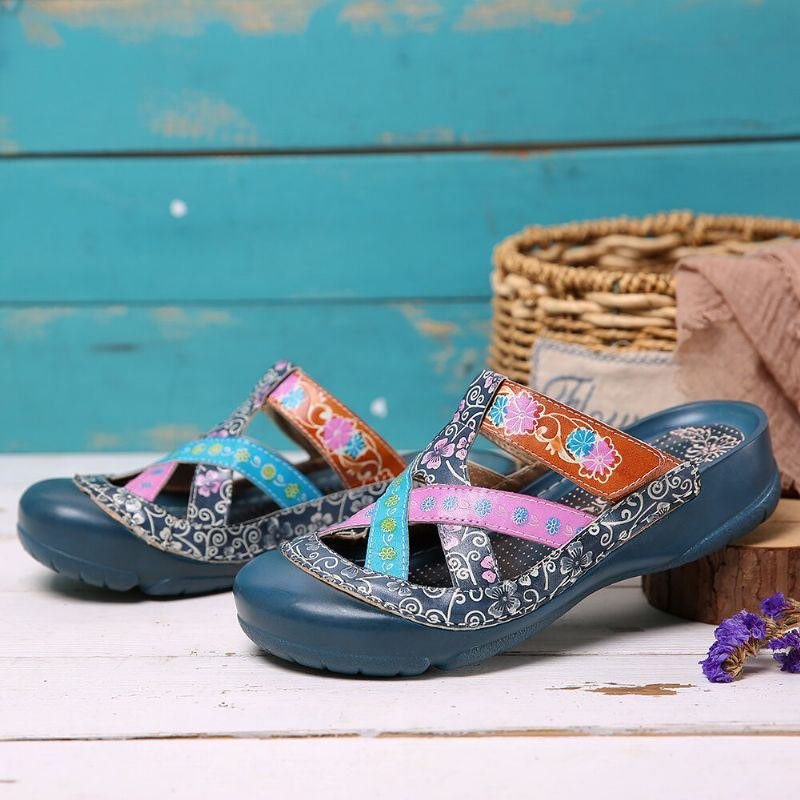 Dameskinn Floral Kryssende Justerbar Stropp Slip-on Mules Clogs Flat Slides Sandaler