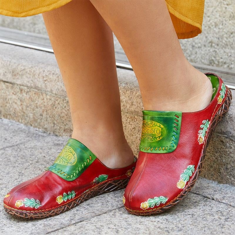 Ekte Skinn For Kvinner Håndlagde Retro Etniske Blomster-påklistre Komfortable Tøfler Med Lukket Tå