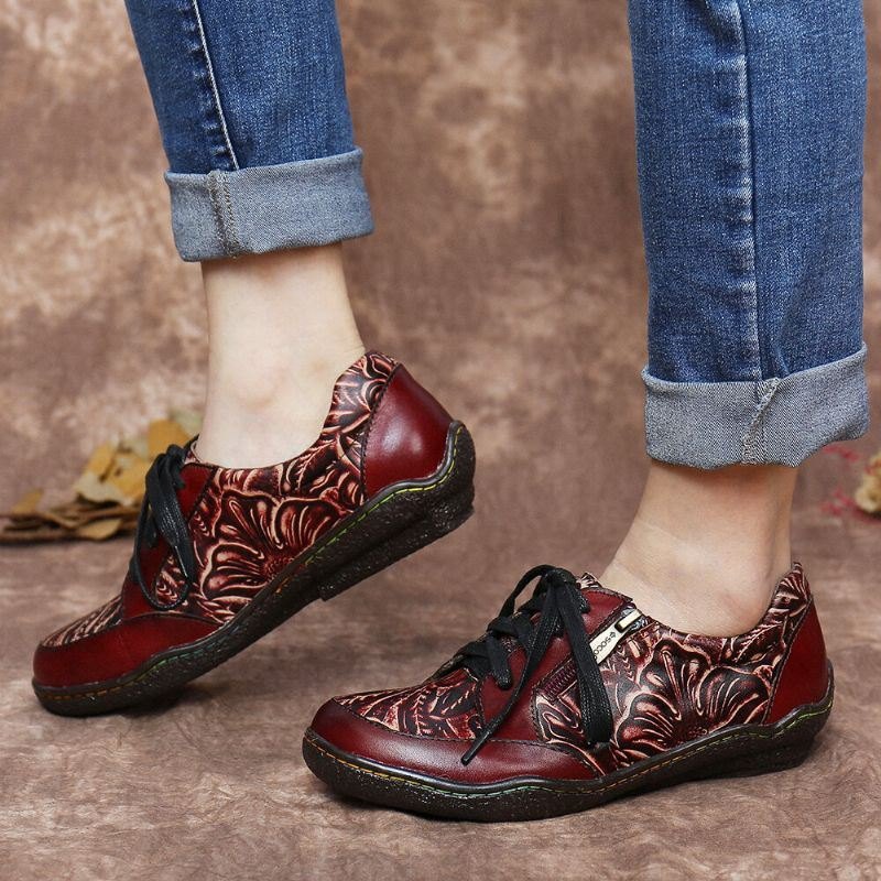 Håndlagde Kvinners Lær Blomster-skjøtesømmer Flate Sko Med Snøring I Siden