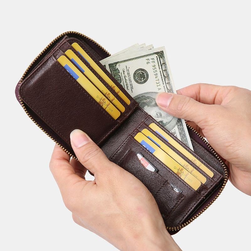 Herre Ekte Skinn Tyverisikring Glidelås Retro Business Multi Card Slot Lær Kortholder Lommebok