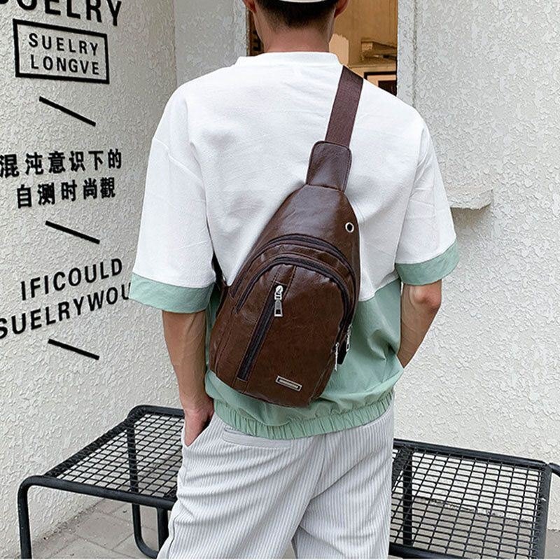 Herre Pu Lær Øretelefonhull Multi-bære Vanntett Crossbody Bag Bryst Bag Sling Bag