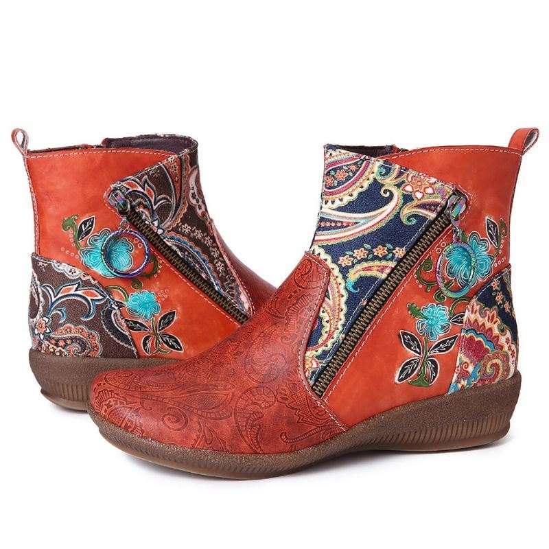 Komfortable Ankelstøvletter I Ekte Skinn Med Blomstermønster For Kvinner