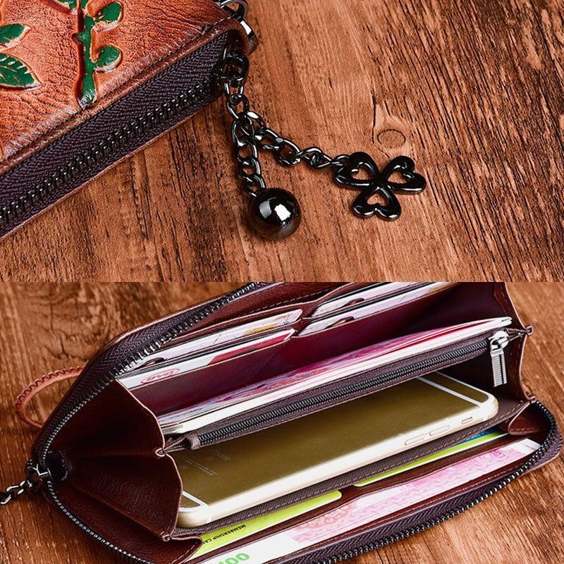 Lommebok I Ekte Skinn For Dame Blomsterpreget Mønster Retro Lang Myntveske Pengelommebøker Clutchvesker