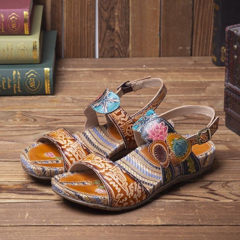 Retro Blomstertrykk For Dame Skinn Behagelige Sandaler Med Flat Stripe
