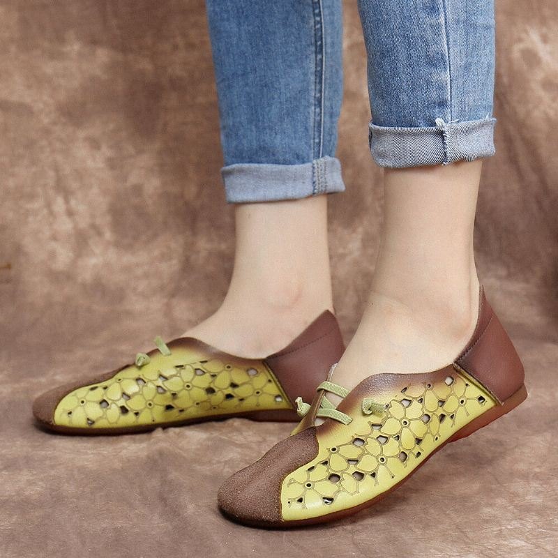 Retro Colorblock Skjøt Skinn Floral Hul Elastisk Stropp Slip-on Flat Sko