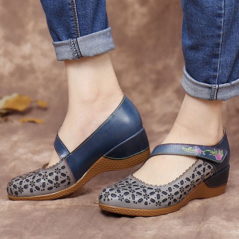 Retro Skinn Blomsterutskjæringer For Dame Rund Tå Preget Blomster Løkkeløkke Kiler Pumper