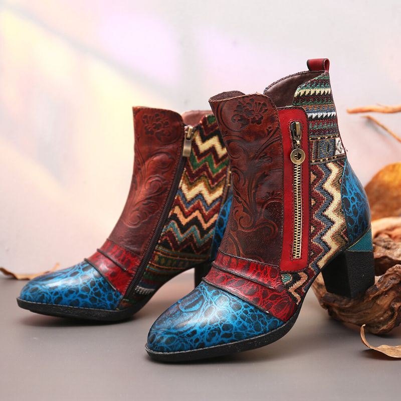 Retro Skinn Preget Blomsterskjøting For Dame I Folkways Stil Dobbel Glidelås Uformelle Støvler