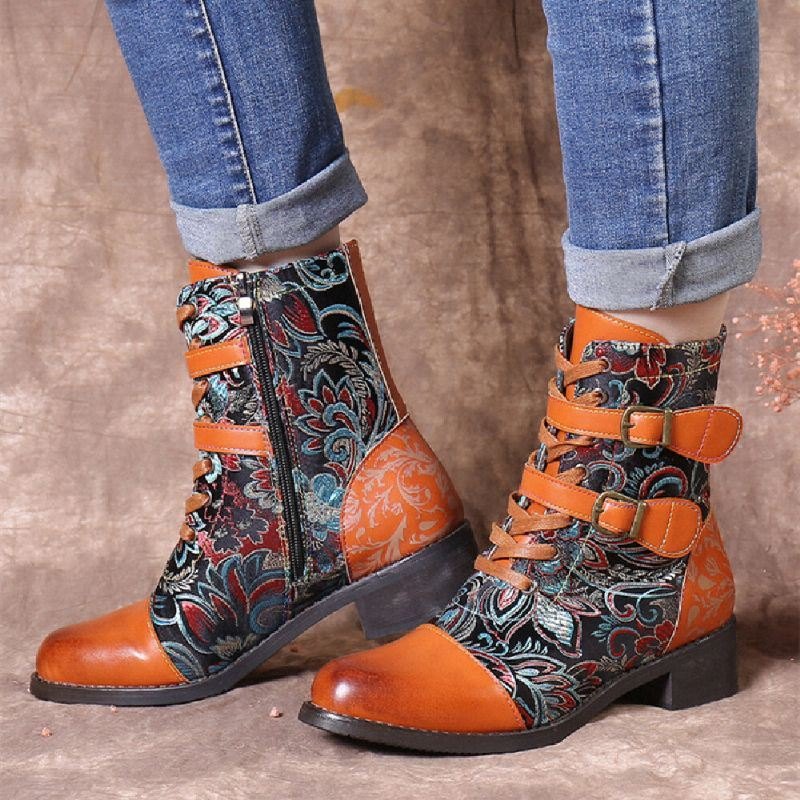 Retro Søm For Dame Nydelige Blomster Klut Metallspenne Varme Korte Støvletter Med Snøre